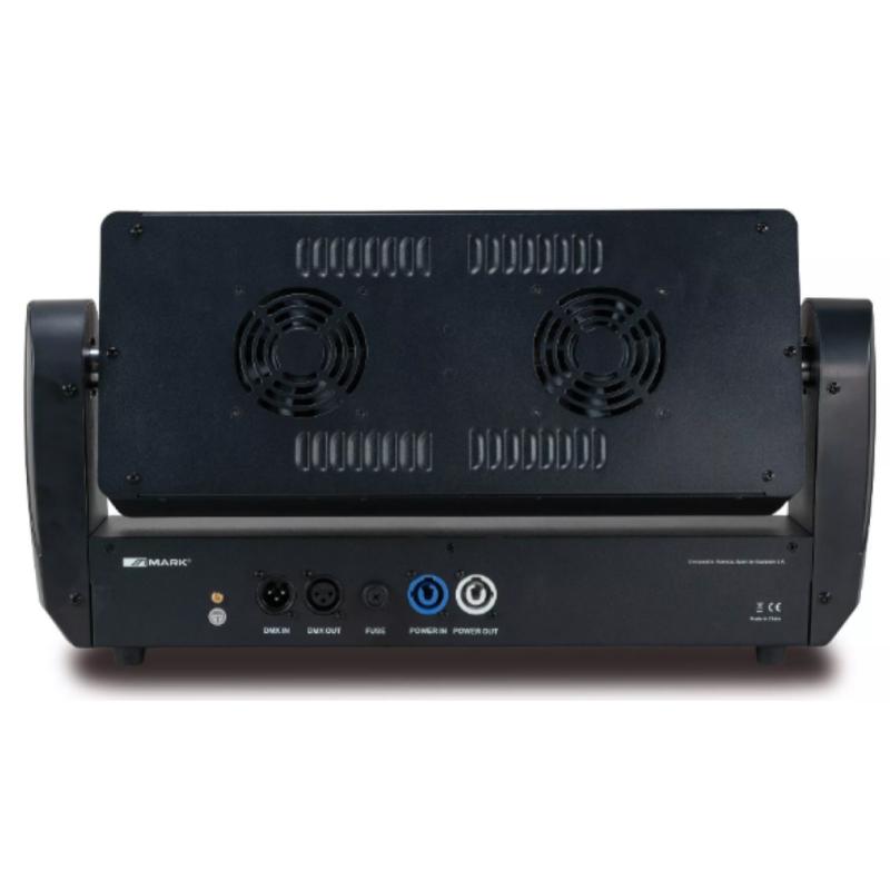 Efecto de iluminación con 2 matrices de LED: 96 LED blancos y 864 LEDs RGB 3en1. Motores silenciosos para la rotación del efecto en eje Y. Pantalla LCD con toda la información y botones para navegar por los menús, seleccionando parámetros para: efectos internos, control manual o efectos de movimiento. Permite actuar con el control de cada LED individual, creando todo tipo de diseños como iconos, letras, números o incluso dibujos aparte de los usuales efectos de iluminación, estrobo o cambios de color. 3 modos DMX (8, 20 y 52 canales) con dimmerización de color individual, efectos integrados, control de sonido y función estrobo. Incluye sistema para colgar.