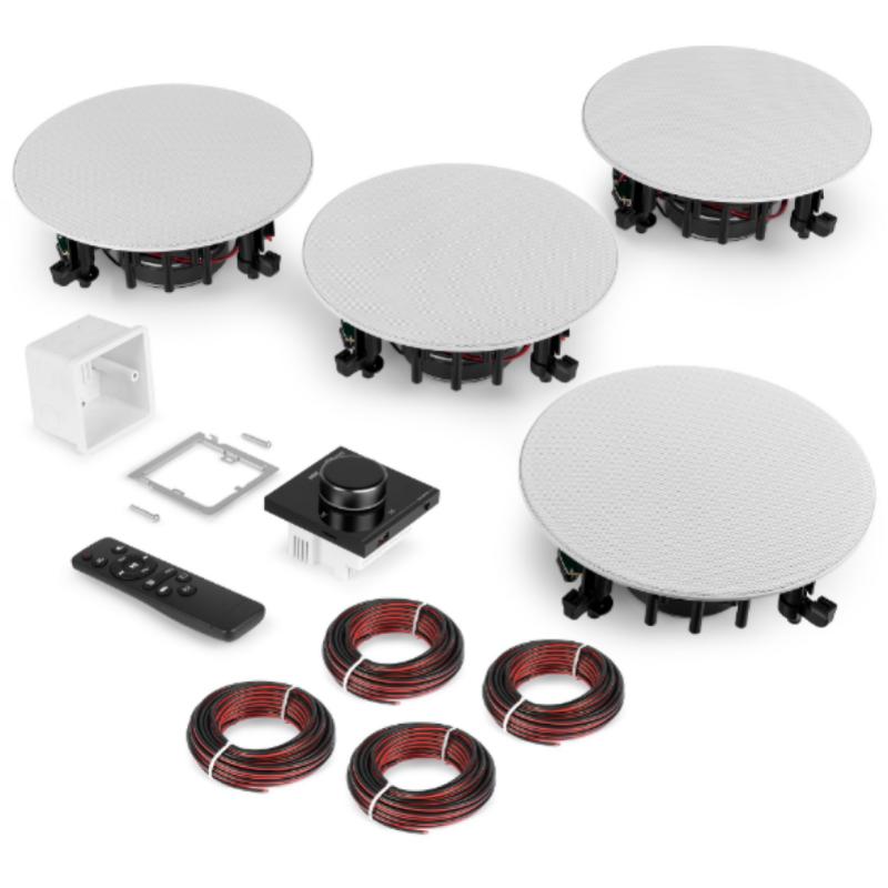 Conjunto de 4 altavoces de techo de 6.5" y Amplificador empotrable 4 x 25W @4 Ohms. BlueTooth. Mando a distancia
