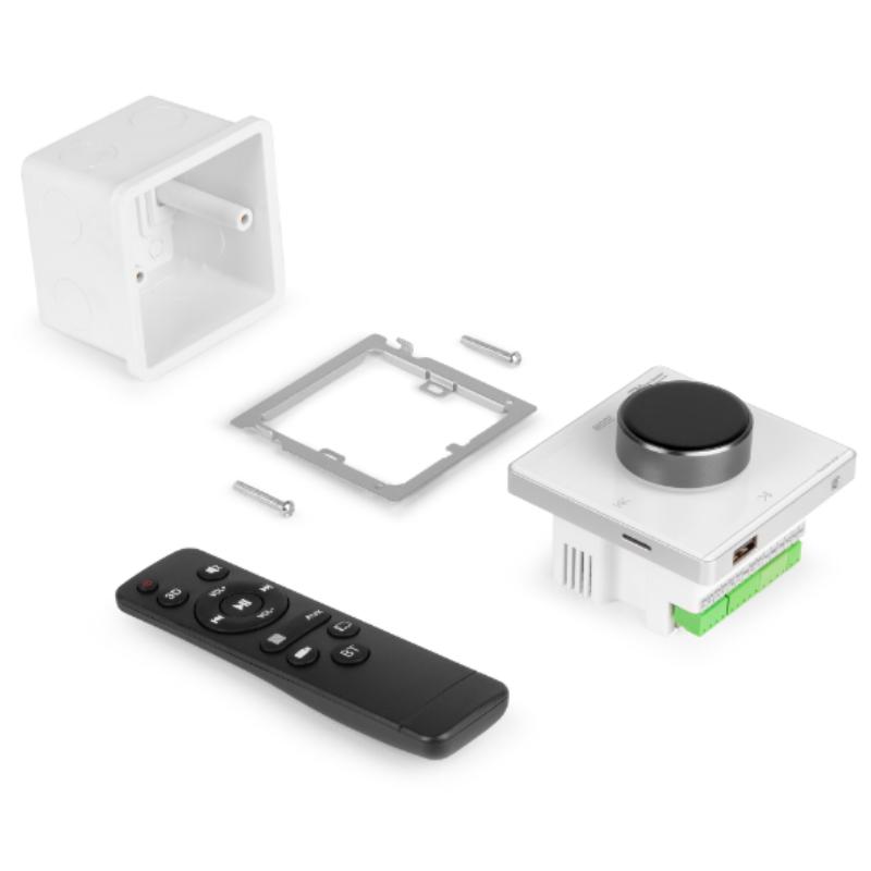 Amplificador empotrable 4 x 25 Watios. Transmisión Bluetooth, USB, MicroSD, Entrada de línea. Mando a distancia inalámbrico. Color Blanco