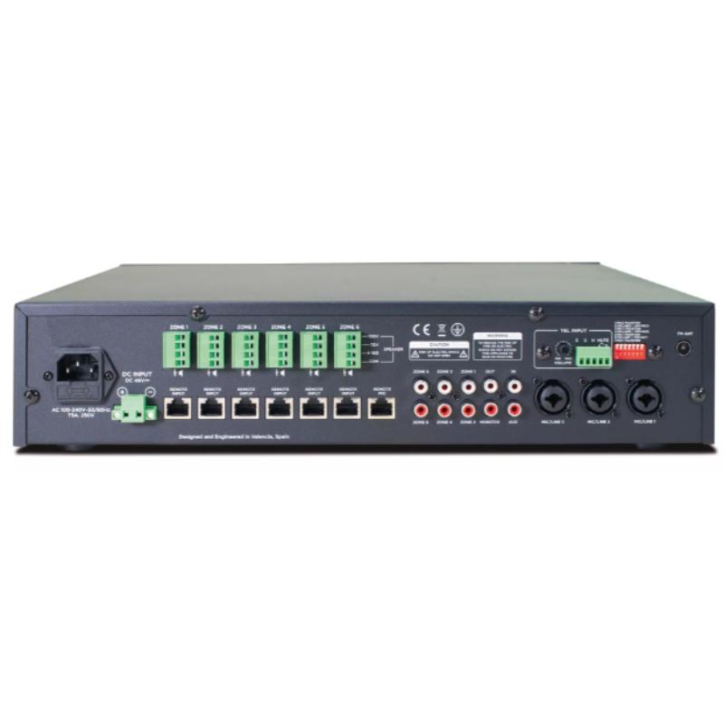 Amplificador/mezclador de instalación con 6 zonas. 6 x 60W @4-16 ohm y 70/100V. USB/SD/Bluetooth/Radio FM