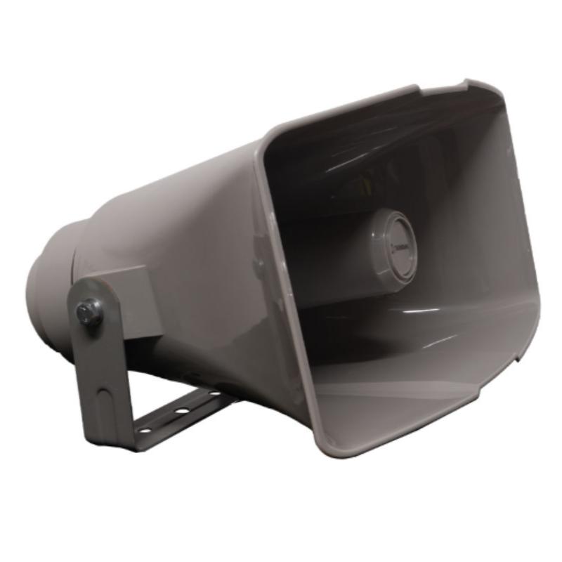 proyector de sonido con bocina exponencial, fabricado en plástico ABS de alta resistencia, y adecuado para instalaciones de baja impedancia. Incluye soporte de instalación.